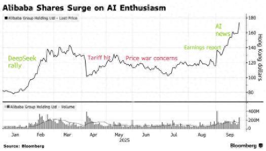 由于对人工智能项目的支出,阿里巴巴再次成为中国最热门的科技股。投资者纷纷重返这家价值 4200 亿美元的互联网巨头的股票市场。周三恒利决策,阿里巴巴(BABA.US)美股大幅上涨,涨幅一度高达 10%,最终收涨8%。港股在 9 月份迄今更是上涨了 50%,成为恒生科技指数中表现最佳的股票。